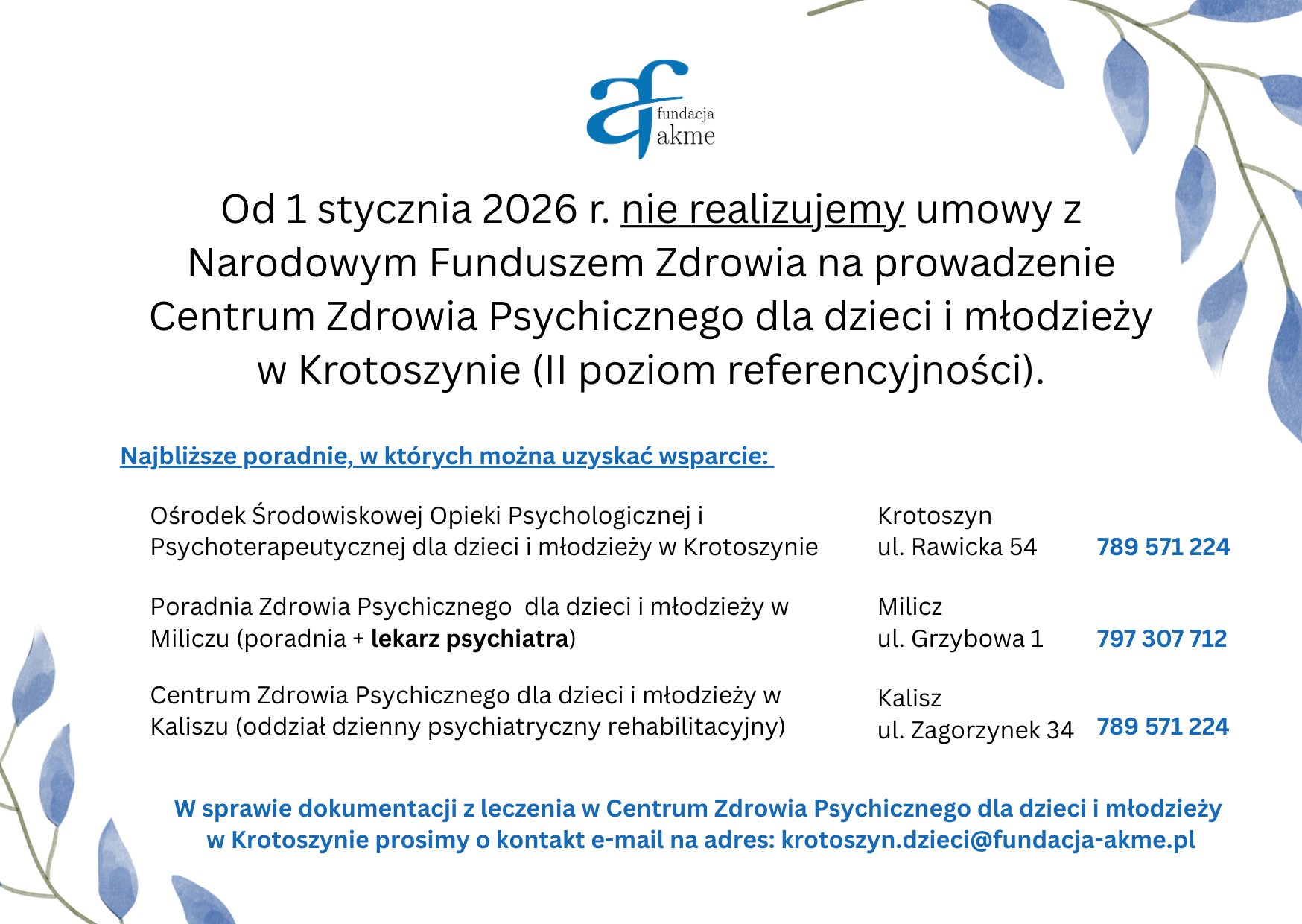 W ramach wsparcia Narodowego Funduszu Zdrowia prowadzimy poradnie psychologiczne/psychiatryczne dla dzieci i młodzieży (oraz ich rodzin) bez rejonizacji. Wybierz swoją poradnie NFZ: Ośrodek środowiskowej opieki